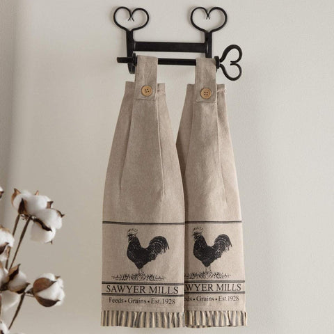 Our Sawyer Mill Collection is trending and so easy to see why! With its farmhouse vintage style of ticking, stenciling and patchworks, decorating has never been easier to mix and match! *****The Sawyer Mill Charcoal Poultry Button Loop Kitchen Towel brings a unique farmhouse look to your kitchen. Featuring a farmhouse rooster at the bottom stenciled in distressed black, accented with...