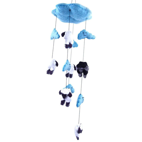 So darn cute, this hand-felted have-you-any wool mobile from Nepal with colored clouds and sheep will help get your little one to sleep. Hangs approximately 19 inches on 4 unique strands with a mixture of clouds and sheep.Meet the Artisans Global Groove is a fair trade organization working with women by supporting and developing artisan co-ops in Thailand and Nepal....