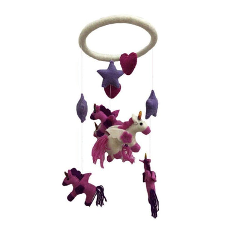 Handmade by Nepalese artisans, this felt mobile features a herd of unicorns and hangs approximately 20 inches.Meet the Artisans Global Groove is a fair trade organization working with women by supporting and developing artisan co-ops in Thailand and Nepal. The Fair Trade industry is expanding and we are proud to be a part of a sustainable movement that is changing...