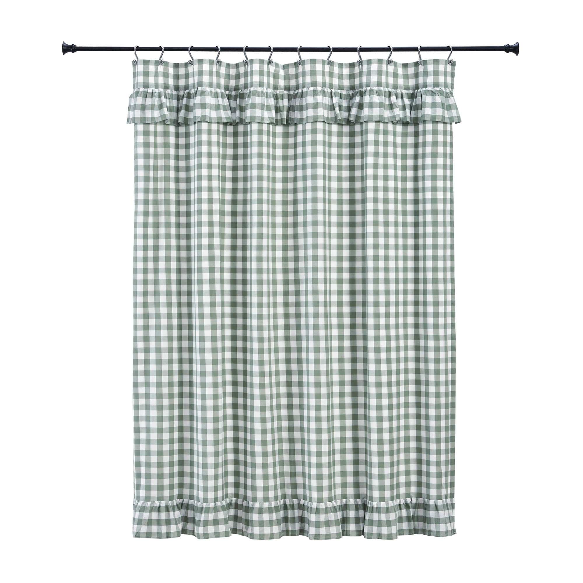 Decorate your bathroom with the perfect blend of simplicity and country charm with the Annie Buffalo Green Check Ruffled Check Shower Curtain. Featuring large scale sage green and white checks beautifully accented with ruffles, our 72x72 fabric shower curtain provides a vintage, farmhouse touch to your decor. This machine washable, 100% cotton shower curtain includes button holes for shower hooks and a rod pocket for versatility and convenience.