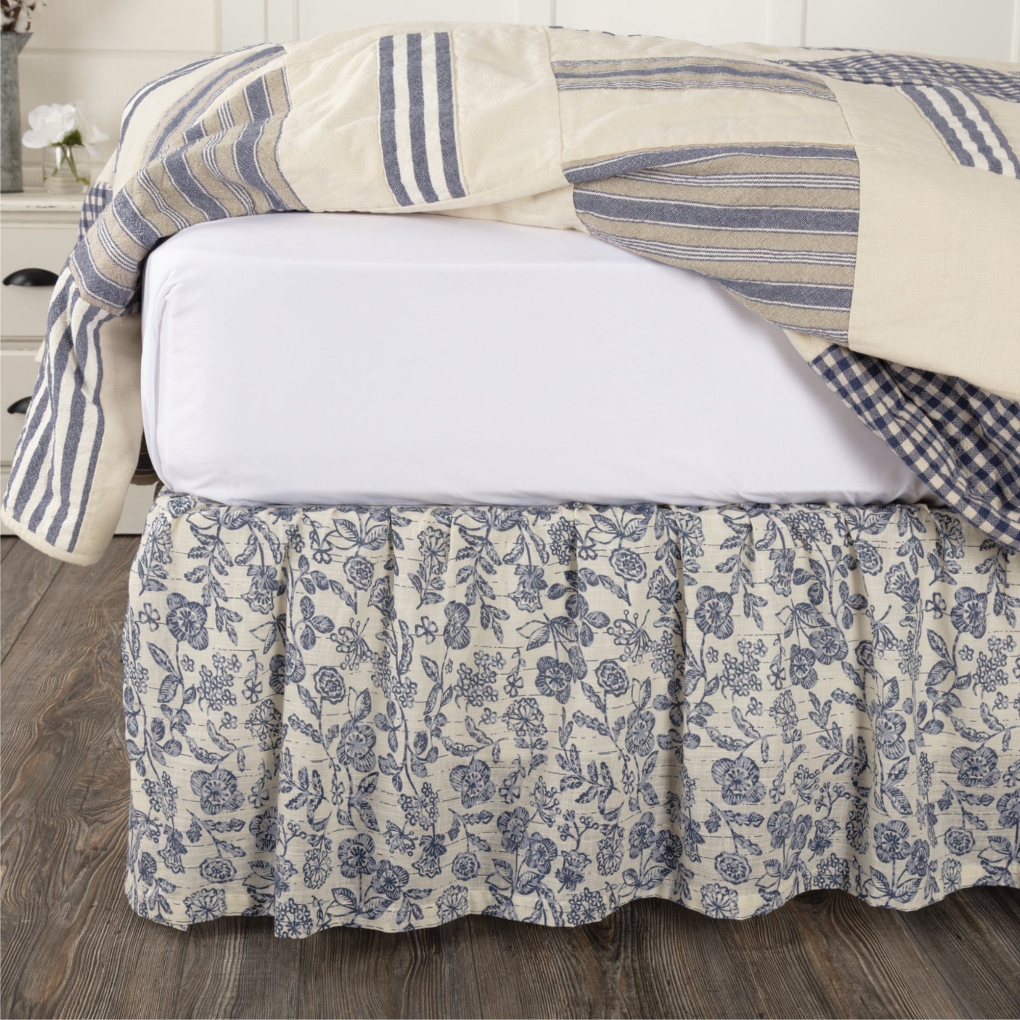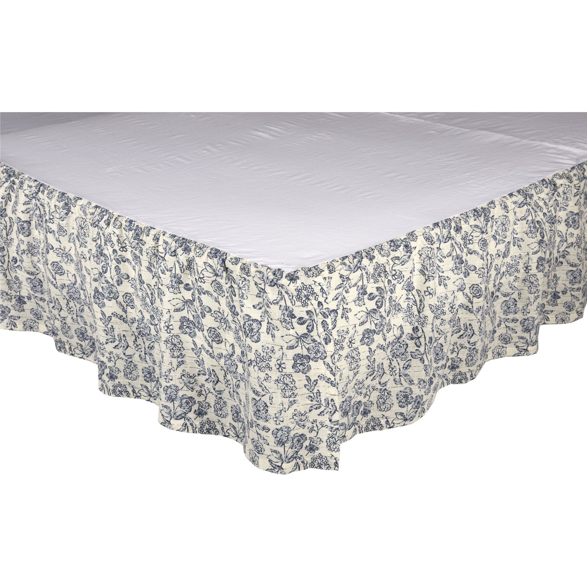 • Farmhouse Floral - Bed skirt features a two-tone denim blue floral print gathered ruffle with 16 drop; COTTON SLUB: Creme base material is a textured cotton slub; QUALITY FINISH: Finished with our standard 1 hem fold; COVERAGE: This bed skirt contains a white cotton decking for easy box spring coverage; EASY USE: Finished with split corners; SINGLE FABRIC: Machine stitched