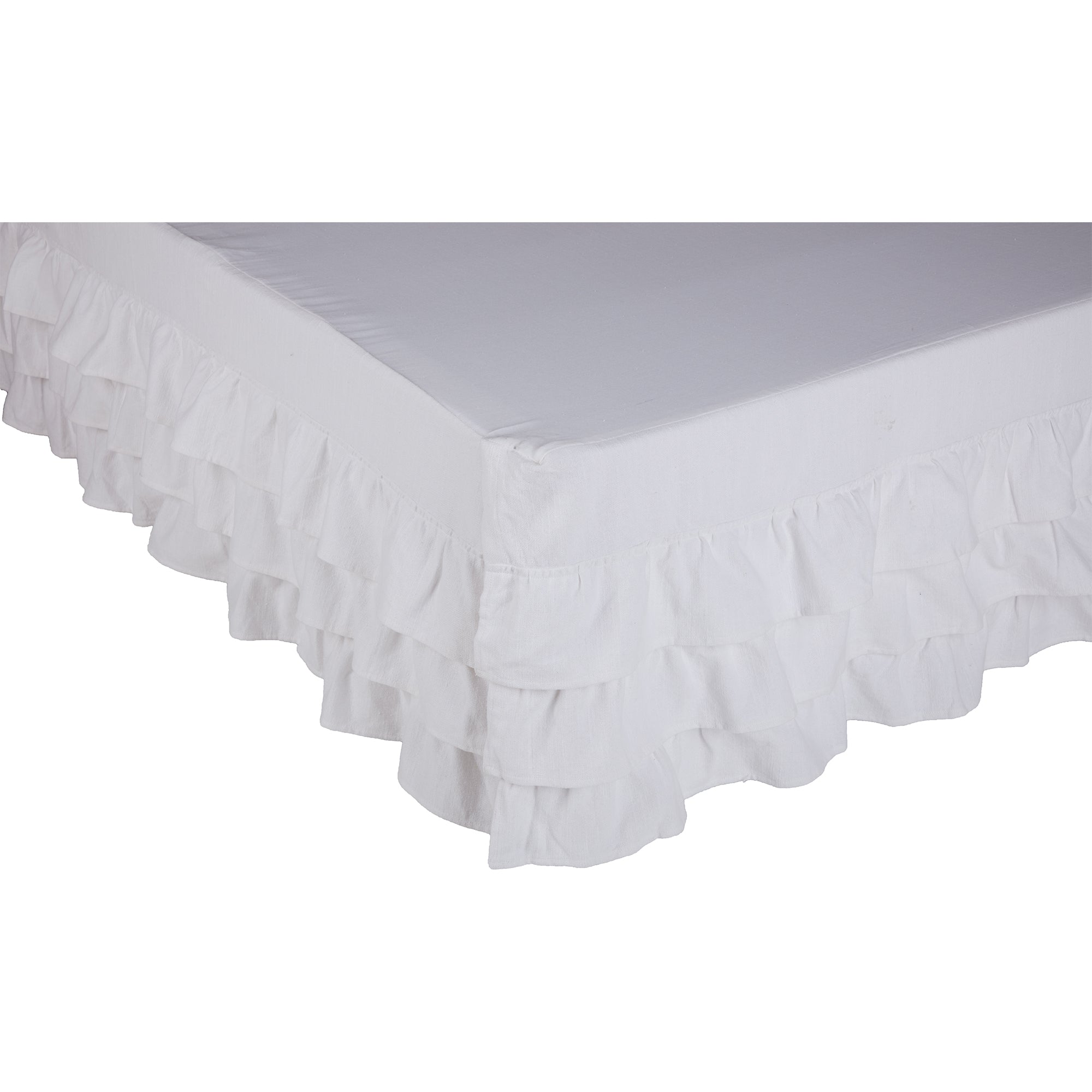 - Rustic elegance and casual sophistication of the Serenity fabric brings the farmhouse look to your bedroom. The crisp white brightens every corner and the luxurious, ruffles layer beautifully over the box spring and bed frame. The white blends seamlessly regardless of decorating style. The bed skirt features a substantial-weight cotton that is durable and surprisingly soft to touch. Three rows of single-layer ruffles adorn three sides of the bed skirt, offering an opulent excess of fabric.