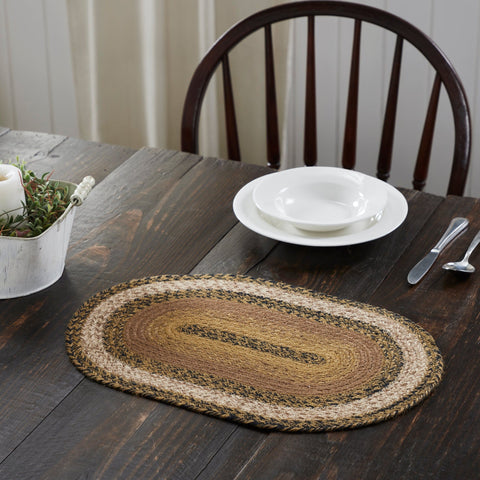 Accent your table with the 12x18 inch Heritage Farms Jute Oval Placemat, featuring alternating solid and mixed braids to accent your primitive country decor. Crafted with jute blend fibers and a tighter weave, allowing it to lay flatter. Features Primitive Decor Placemat - Our Heritage Farms Jute 12x18 inch oval Placemat features alternating solid and mixed braids in a warm...
