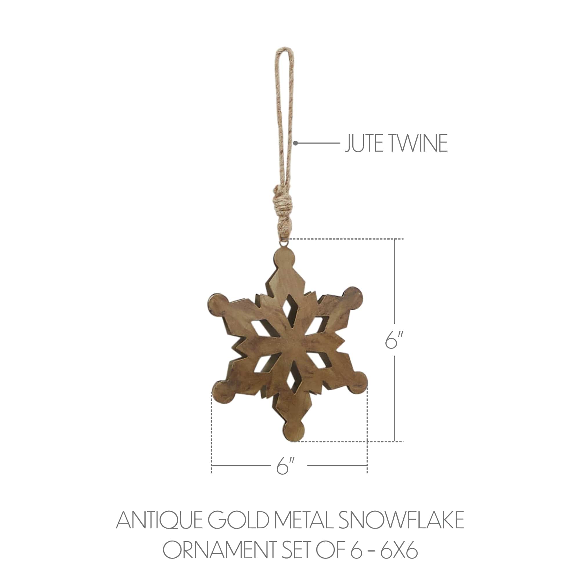 Add timeless elegance to your holiday decor with the VHC Brands Metal Snowflake Ornament Set of 6. Crafted from sturdy metal, each ornament features a vintage-style snowflake cutout design finished in a warm antique gold tone. The intricate detailing and solid color create a refined, classic look, while the twine hangers lend a rustic, handcrafted charm perfect for traditional or farmhouse-style Christmas themes. These snowflake ornaments are ideal for adding a festive touch to Christmas trees, garlands, wreaths, or tabletop displays. The antique gold finish offers a subtle shimmer that catches the light beautifully, making them a versatile addition to both neutral and colorful holiday palettes. Lightweight yet durable, they're easy to hang and enjoy throughout the season. Perfect for decorating the bathroom, bedroom, dining room, entryway, kitchen, or living room, this set of six ornaments brings a sense of winter wonder and vintage warmth to your home. Whether grouped together or spread across multiple areas, the VHC Brands Metal Snowflake Ornaments offer a cohesive and elegant seasonal accent. To maintain their finish, simply wipe clean with a soft cloth.