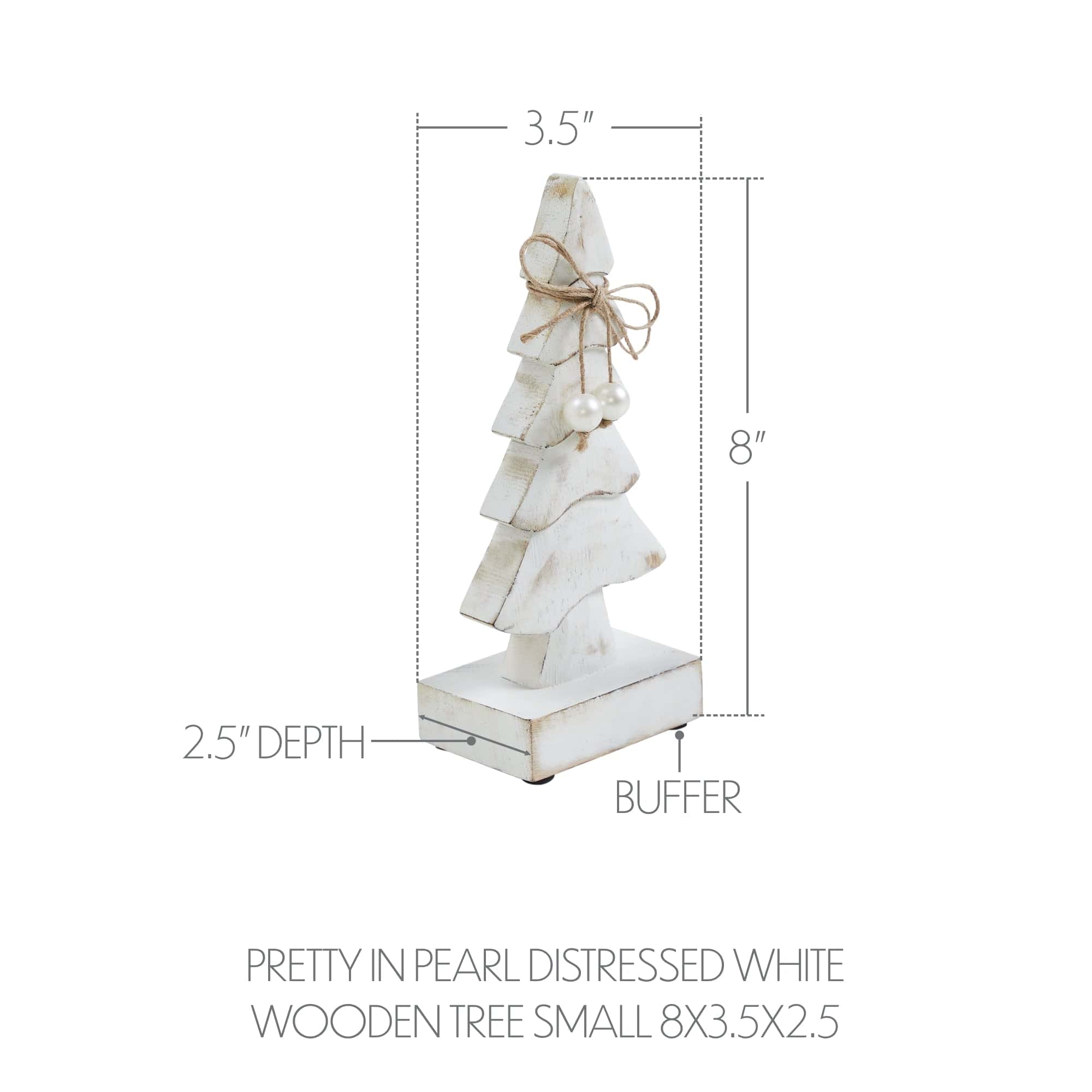 Add a soft, rustic accent to your winter decor with the VHC Brands Pretty in Pearl Distressed Wooden Christmas Tree in Small. Crafted from tropical wood, this charming figurine features gentle curves and a whitewashed finish with subtle distressing, giving it a handcrafted, timeworn look. A twine bow with pearl beads adds a delicate decorative touch, enhancing its country-inspired style. Measuring 3.5 inches wide by 8 inches tall, this compact tree is mounted on a sturdy wood base for stable display. Its light tan undertones and solid color design make it a versatile piece that pairs well with both classic holiday themes and minimalist winter settings. The smooth curves and neutral tones lend warmth and elegance without overwhelming your space. Ideal for use in the bathroom, bedroom, dining room, entryway, kitchen, or living room, this small winter tree adds a cozy, primitive charm wherever it's placed. Whether styled on a shelf, mantel, or side table, it brings seasonal beauty in a subtle and graceful form. For care, simply wipe clean with a soft cloth to maintain its rustic finish throughout the holidays.