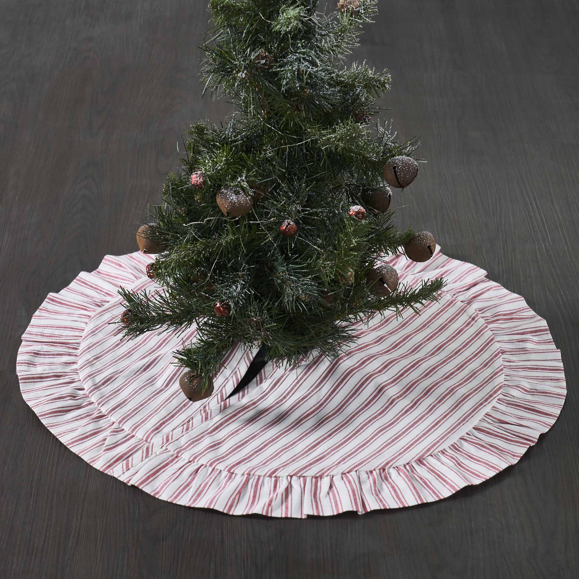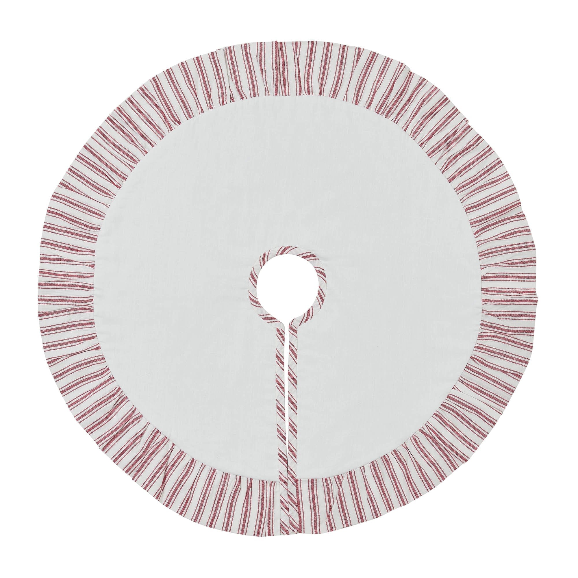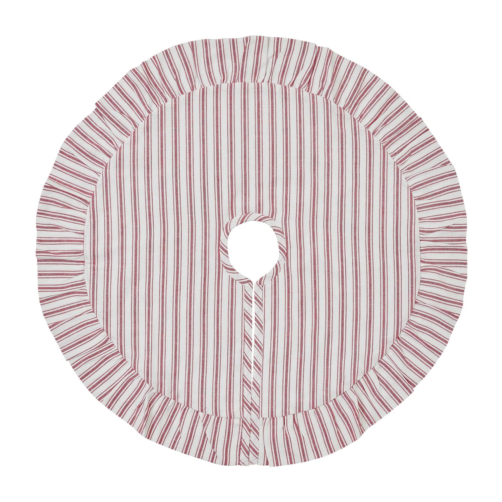 Meet the Timeless Ticking Red Mini Tree Skirt. Just 27 inches in diameter, with a 3-inch opening, it's a snug fit for your festive tree. The front boasts classic, red ticking stripes on a creamy white background, while the back is a clean white voile. Inside, there's a double-layer of flannel filling for that extra touch of coziness. The 3-inch pleated ruffle adds a dash of charm to the whole design. Crafted from 100% cotton, it's a durable and stylish addition to your holiday home d