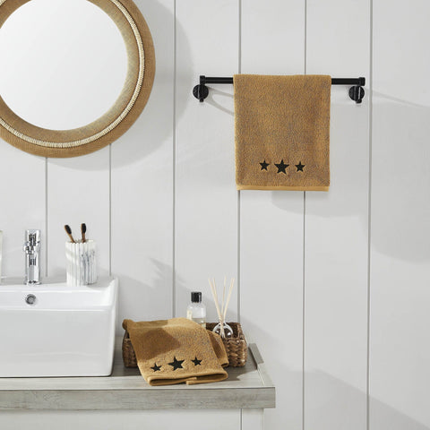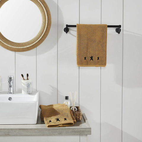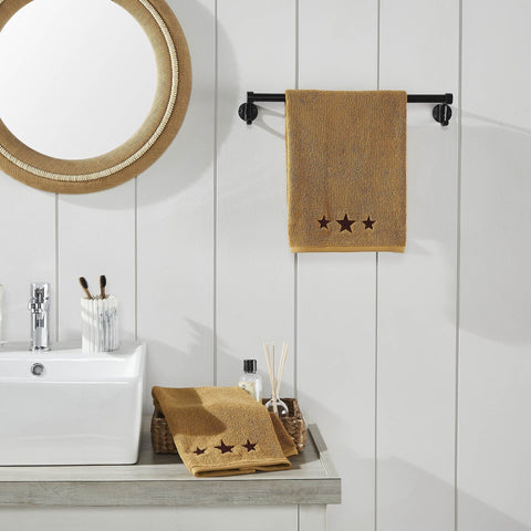 Bring a touch of rustic charm to your bathroom with the VHC Brands Black Prim Stars Tan Hand Towel Set of 2. Made from soft and absorbent cotton terrycloth, these hand towels offer both comfort and durability for everyday use. The neutral doe tan hue provides a warm, versatile background, while the embroidered design at the bottom showcases three primitive...