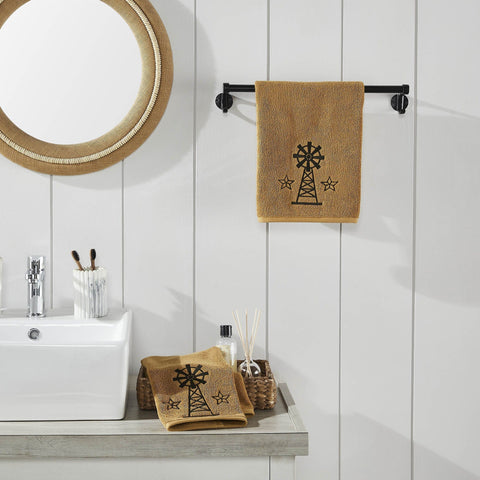 Add a farmhouse touch to your bathroom with the VHC Brands Black Windmill & Stars Tan Hand Towel Set of 2. Crafted from soft and absorbent cotton terrycloth, these towels combine comfort and practicality, perfect for everyday use. The neutral doe tan color provides a warm, inviting background, while the embroidered design at the bottom features a rustic windmill and...