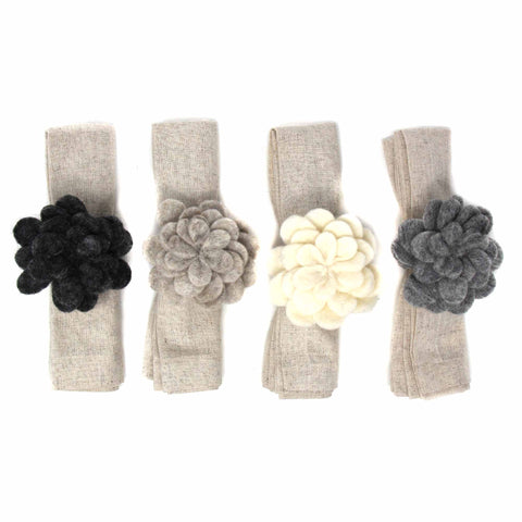 These felted napkins rings are sure to bring some color and fun to your dinner table. Flower measures 4 inches diameter with a 2 inch ring; 4 pack only, colors as shown. Handmade in Nepal. Meet the Artisans Global Groove is a fair trade organization working with women by supporting and developing artisan co-ops in Thailand and Nepal. The Fair...