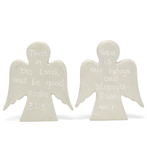Set of 2 hand-carved soapstone angels are beautiful tokens to be held and bring peace. Carry it with you or display it, these angels will offer comfort to those in need. One angel is inscribed with Psalm 37:3 "Trust in the Lord, And be Good"; one angel is inscribed with Psalm 46:1, "God is our refuge and strength." Product Features: Measures approximately...