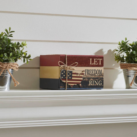 Celebrate the spirit of freedom with the VHC Brands Patriotic Let Freedom Ring MDF Block Sign w/ American Map Ornament On Twine 4x6x5. This decorative block sign is designed to resemble a stack of three blocks, each featuring a single word from the phrase Let Freedom Ring. The design is accented by a charming wood ornament shaped like the U.S.A.,...