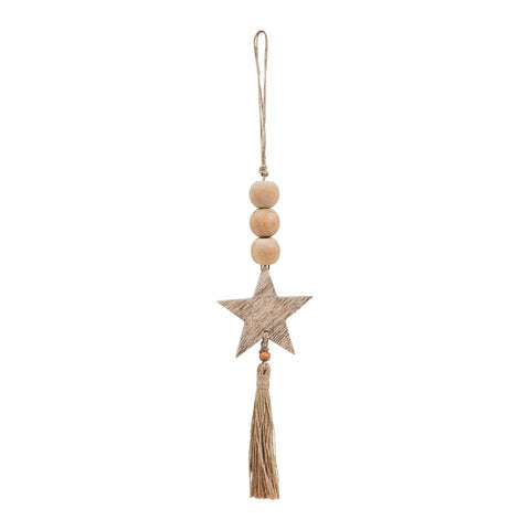 Elevate your patriotic decor with the VHC Brands Patriotic Natural Beads Star & Tassel Ornament 10x3. This rustic ornament features a strand of three natural wood-tone beads leading to a charming 5-point star, tied at the bottom with a coordinating tassel. Its simple yet elegant design adds a touch of farmhouse-inspired charm, making it the perfect accent for Fourth of...