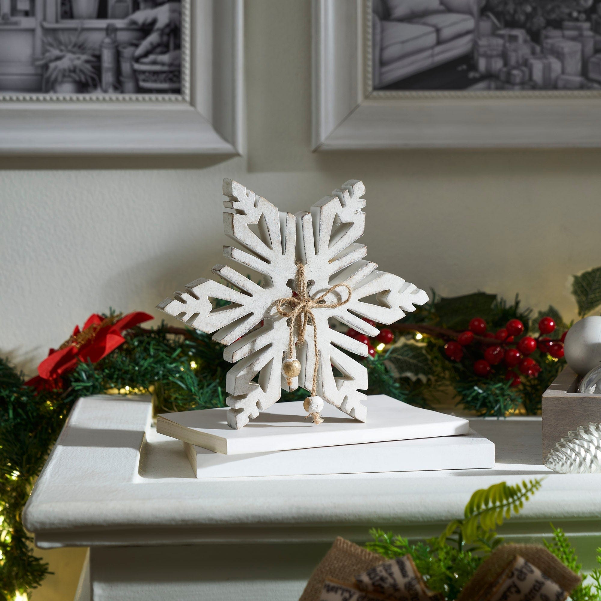 Add a touch of vintage charm to your winter decor with the VHC Brands Distressed Wooden Snowflake. Measuring 5.75x5.75 inches, this primitive-style figurine features a beautifully carved snowflake finished in a soft whitewash with light tan distressing. Its weathered appearance brings a rustic, handcrafted feel that evokes the quiet beauty of a snowy winter day. Accented with a twine bow and small wooden beads, this decorative snowflake embraces a simple, country-inspired aesthetic. Crafted from durable tropical wood, it is designed to stand out on mantels, shelves, or tabletops, making it a versatile addition to farmhouse, rustic, or vintage winter themes. The solid color and delicate detailing ensure it pairs effortlessly with your existing holiday decorations. Perfect for display in any room-bathroom, bedroom, dining room, entryway, kitchen, or living room-the Distressed Wooden Snowflake adds cozy elegance to your seasonal setting. Easy to maintain, simply wipe clean with a soft cloth to preserve its natural beauty. This charming piece is a timeless addition to your winter collection, bringing warmth and character year after year.