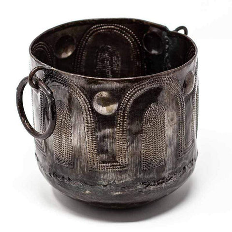 Beautiful hammered bowl with intricate designs made from Haitian Steel Oil Drums. Featuring sturdy round handles for ease of carry. This artistic bowl is both decorative and functional. The edges are rounded and smooth, making this a great functional bowl. Or, a beautiful piece of art in any to complement any decor! Measures 6 x 5 inches. Meet the Artisans...