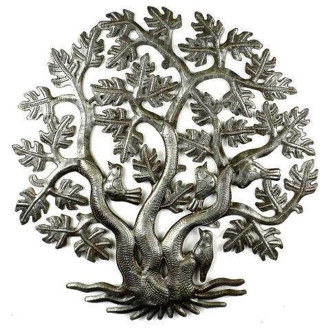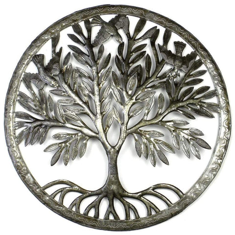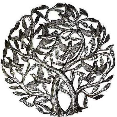 This piece of Haitian metal wall art is 24 inches in diameter. It features a tree of life with birds, hand-cut, embossed and painted.Meet the Artisans When you visit Croix des Bouquets, the area of town known for Haitian metal art in the capital of Port-Au-Prince, you are met with a cacophony of tink, tink, tink as ball peen hammers...