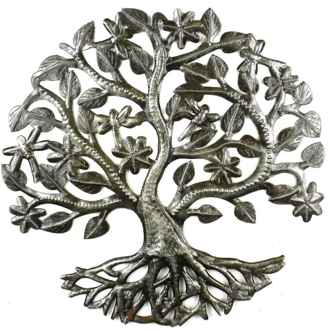 This piece features a tree of life framed in a ring in this traditional Haitian design. Hand cut and embossed, this piece is 23 inches in diameter.Meet the Artisans When you visit Croix des Bouquets, the area of town known for Haitian metal art in the capital of Port-Au-Prince, you are met with a cacophony of tink, tink, tink as...