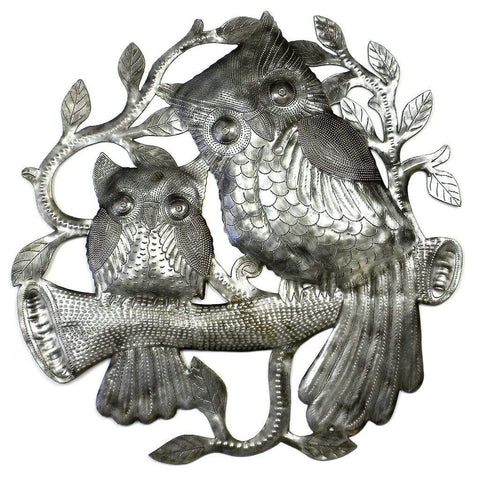 This piece features a pair owl on a perch design in this traditional Haitian design. Hand cut and embossed, this piece is 23 inches in diameter. Meet the Artisans When you visit Croix des Bouquets, the area of town known for Haitian metal art in the capital of Port-Au-Prince, you are met with a cacophony of tink, tink, tink as...