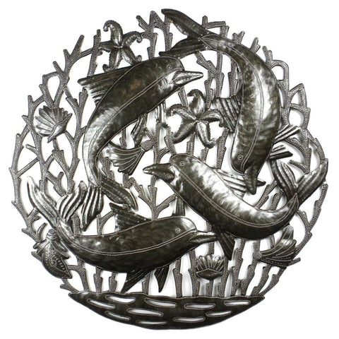 Depicting a pod of dolphins in the ocean, this piece of metalwork, handcut and embossed from recycled oil drums in Croix des Bouquets, Haiti, has a natural patina of the oiled metal. It is 24 inches in diameter. Suitable for indoor or outdoor use.Meet the Artisans When you visit Croix des Bouquets, the area of town known for Haitian metal...