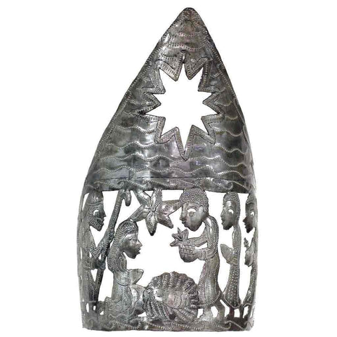 This tabletop Nativity Scene features Mary, Joseph and Three Wisemen bringing gifts to Baby Jesus. Features candle holder to illuminate the scene. Handcrafted in Haiti by local artisans from recycled oil drums. Measures approximately 13 x 7 inches.Meet the Artisans When you visit Croix des Bouquets, the area of town known for Haitian metal art in the capital of Port-Au-Prince,...