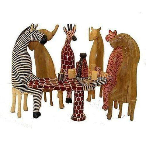 These six carved animals sit around a map of Africa. Each animal and stool is a single piece of wood. The set includes a glass for each animal and a wine bottle. Each animal is approximately 8 inches tall.Meet the Artisans Working with more than 100 individual carvers in Machakos, Kenya,Jedando Modern Handicrafts markets african handicrafts primarily made of wood...