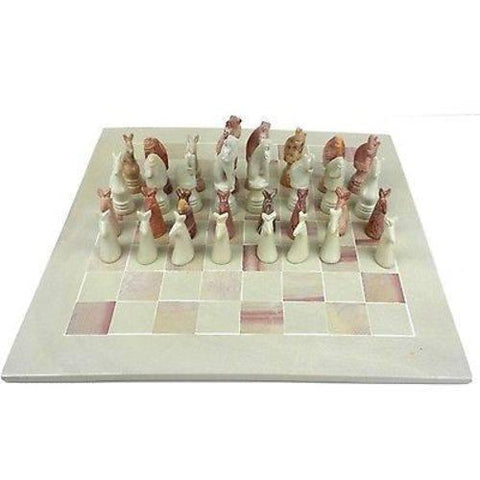 Hand-carved from soapstone in Kenya, this chess set features 32 delicate pieces in an animal theme on a 15-inch square board. As each piece is hand carved from natural stone, please allow for some variations in color and design.Meet the Artisans Our Soapstone is carved by the artists of SMOLArt a group of artists who live in the rural village...