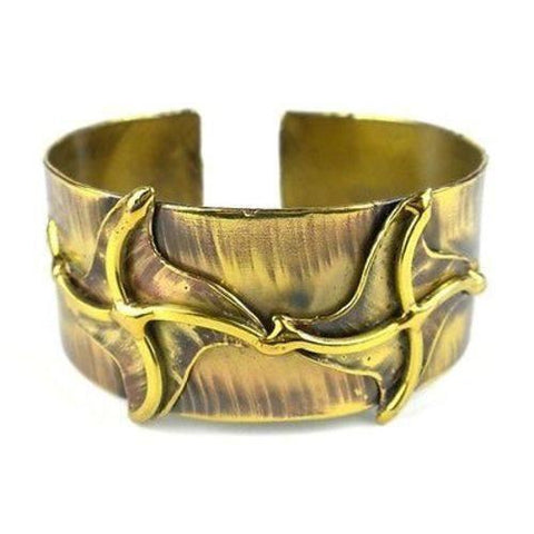 Handcrafted by South African artisans, this brass cuff with a feathered edge is accented with two pinwheels of brilliant brass. The feathering on this 1.1-inch bracelet is achieved by applying extreme heat rather than paints or dyes.Meet the Artisans Brass Images was established in 1988 in the coastal town of Plettenberg Bay, South Africa, about a 4 hour drive out...