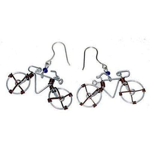Made from recycled copper and steel wire, these earrings are inspired by a common mode of transportation in Western Kenya - the bicycle. Called a "boda boda" by the locals, bicycles are used as public transportation (you ride on a padded rack on the back) and are named for the bicycles used to transport people across the border between Uganda...