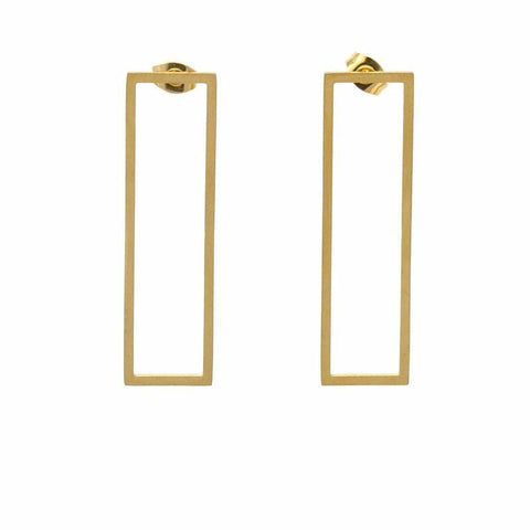 18k gold layered over stainless steel form these handcrafted rectangle stud earrings. Width is .5 inch. Drop is 1.75 inches.This purchase transforms lives. Jewelry proceeds help exploited women and girls experience freedom, establish independence and develop careers. Helpful Tips: Keep jewelry away from water and harsh chemicals; store separately in a soft pouch.Meet the Artisans There are exploited women in...