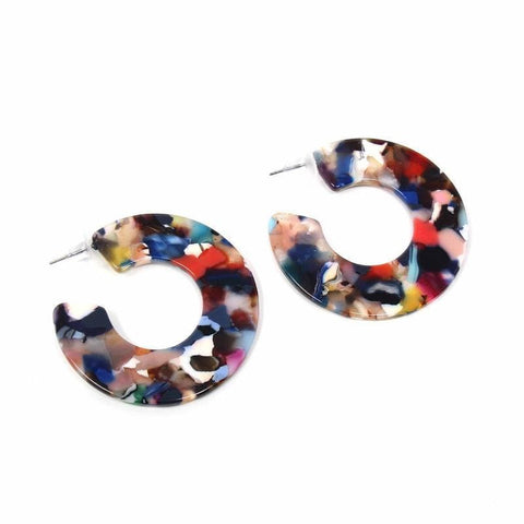 Happiness in a hoop! Behold the colorful love and swirls! Handcrafted wide hoop earrings in multi-colored resin. Hypoallergenic post. 1.75 inch width. Drop is 2 inches. Due to the organic nature of acetate/resin, the marbleization of each piece will vary.This purchase transforms lives. Jewelry proceeds help exploited women and girls experience freedom, establish independence and develop careers. Helpful Tips: Keep...