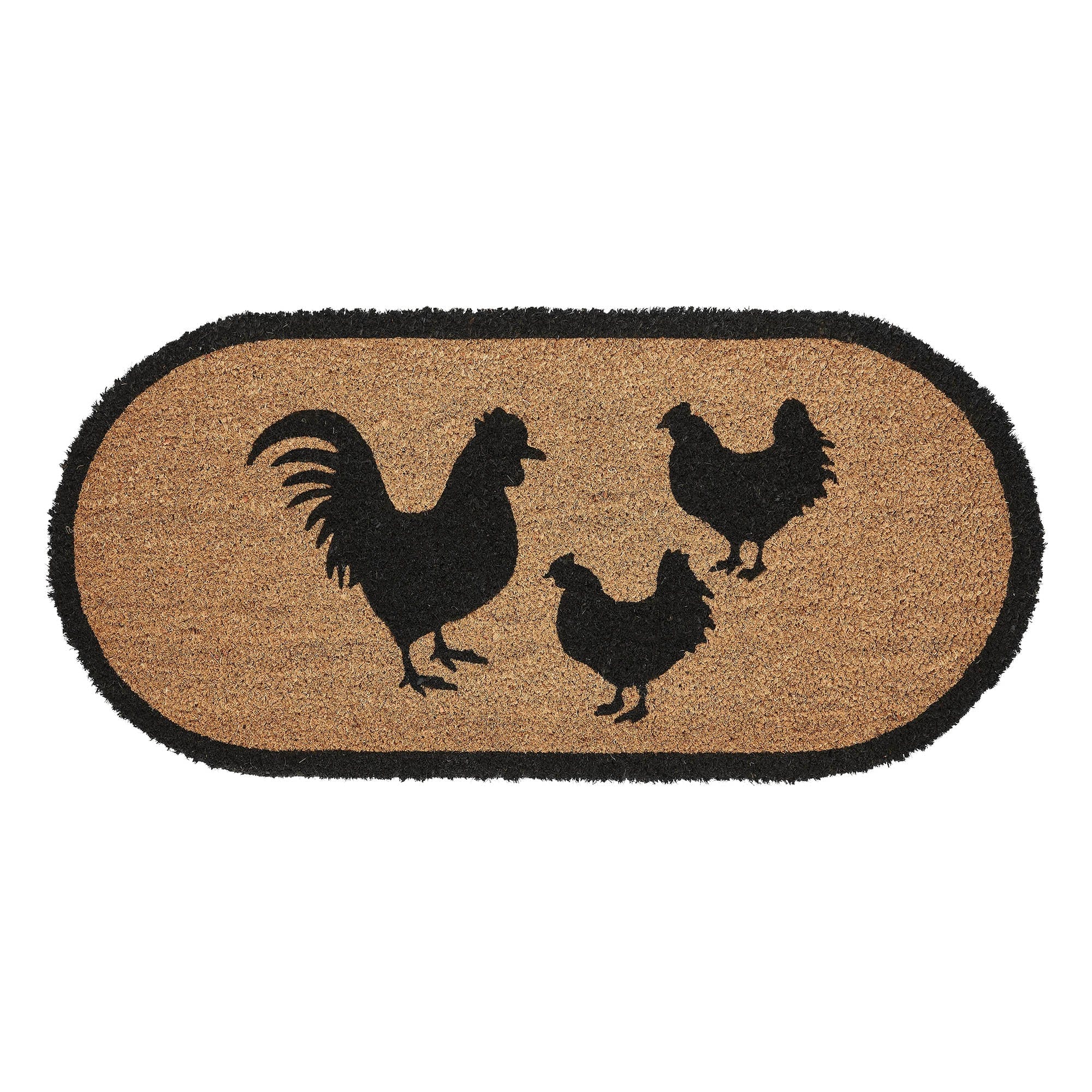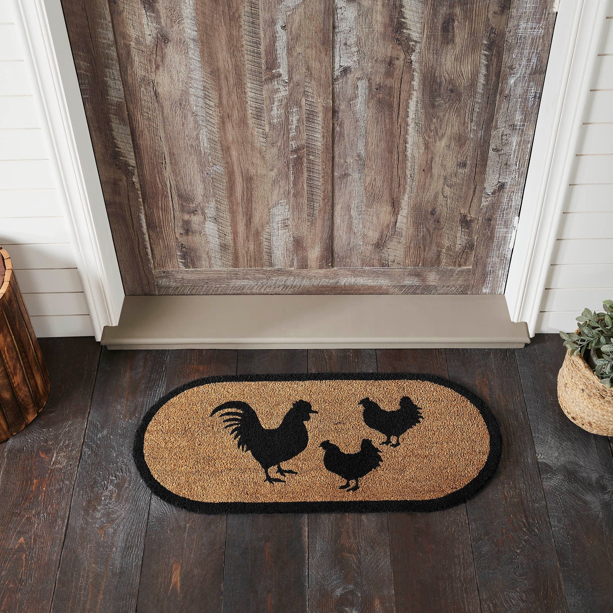 Introducing the VHC Brands Coir Welcome Door Mat from the Down Home Collection, a charming addition to enhance your home's entrance with rustic Country charm. This oval 17x36-inch doormat features a delightful Rooster and Hens graphic, adding farmhouse character to your outdoor fall decor. Crafted with a bristled and textured coir surface, it provides a warm and inviting atmosphere on your front porch or entryway. Designed for both indoor and outdoor use, this coir doormat comes with PVC backing for enhanced durability and slip-resistance, ensuring it withstands the elements throughout the seasons. Its slim profile effortlessly fits beneath most doors, and the eco-friendly coir material aligns with modern sustainability values. Welcome guests with a warm and inviting touch using the VHC Brands Coir Welcome Door Mat, the ideal choice for creating a memorable entrance that captures the essence of farm life. Upgrade your entrance with the Down Home Collection's Coir Welcome Door Mat, where the Rooster and Hens graphic adds a touch of rustic elegance to your porch or exterior entryway. Crafted from premium coir, this doormat provides a textured surface that feels inviting, and its eco-conscious construction aligns with modern sustainability values. This doormat's durable design ensures it thrives outdoors in any season, accommodating gatherings of all sizes. Welcome guests with a heartfelt message that resonates with the beauty of this natural, country-inspired doormat and the charm of farm living.
