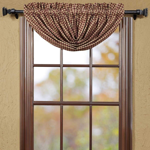Burgundy and tan checks are blended with faded texture at points of intersection to give a modern facelift to the classic pattern on the Burgundy Check Balloon Valance.Features PREMIUM CONSTRUCTION: with over two decades experience crafting goods for American homes, our item are built to last for years to come. PRIMITIVE DECOR: traditional style that compliments any primitive or Americana...