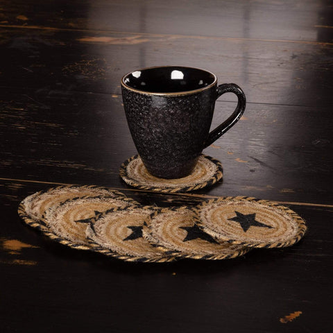 The Farmhouse Jute Coaster Stencil Star Set of 6 is just right for the dining room or family getaway. Jute is a naturally absorbent material making it perfect as a coaster. Featuring alternating braids in black and tan and a stenciled center black 5 point star.Features PREMIUM CONSTRUCTION: with over two decades experience crafting goods for American homes, our item...