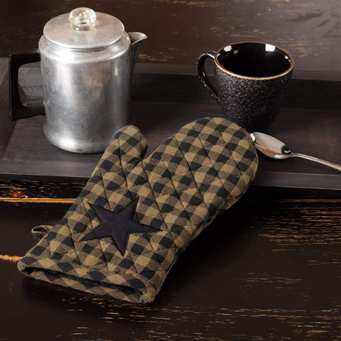 Complement your contemporary country kitchen with the Black Star Oven Mitt. This stylish country oven mitt features classic check pattern in black and khaki, decorated with a solid black appliqued 5-point star centered toward the bottom. Easily hang your oven mitt within reach of your fresh baked cookies in the oven with the 1 inch loop on the side.Features PREMIUM...