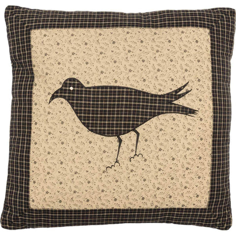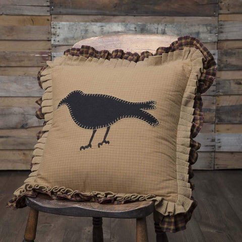 Bring a taste of primitive anywhere in the home with the generously 18x18 sized Primitive Crow Pillow. The crow in the center is appliqued in black felt with tan whip stitching on a mustard plaid base. A double ruffle in natural burlap and burgundy, tan, and black is the finishing touch. Reverses to burgundy, tan, and black check with 2...