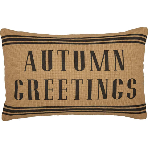 Welcome Autumn into your home with warm and cozy comfort. The Heritage Farms Autumn Greetings Pillow presents a natural, earthy vibe featuring cotton burlap and the words "Autumn Greetings" covering the front surrounded by grain sack stripes in black. Reverses to natural cotton burlap with button closures. This seasonal throw pillow is the perfect accessory for a decorative chair or...