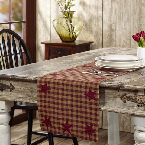 The Burgundy Star Runner presents a charming burgundy and tan check pattern. Decorated with burgundy appliqued 5 point stars lining the edges.Features PREMIUM CONSTRUCTION: with over two decades experience crafting goods for American homes, our item are built to last for years to come. PRIMITIVE DECOR: traditional style that compliments any primitive or Americana home. QUALITY MATERIAL: made with durable...