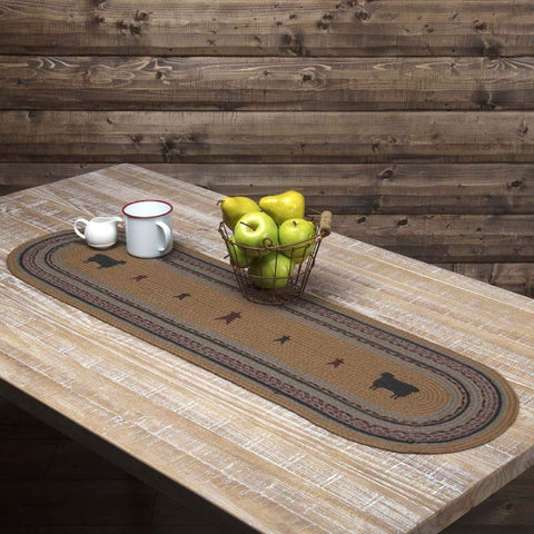 The Heritage Farms Sheep Jute Runner Oval 13x36 lifts its colors from the bedding set to complete a quietly primitive look throughout the entire house. Sheep stenciling bookending primitive stars adds a homey flair to this runner.Features PREMIUM CONSTRUCTION: with over two decades experience crafting goods for American homes, our item are built to last for years to come. PRIMITIVE...