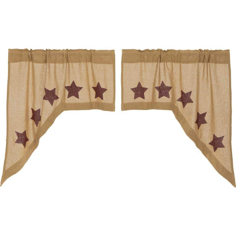 Burlap w/Burgundy Stencil Stars Swag Set features natural burlap with a rod pocket that measures 3.25 inch in height which allows for a wide variety of hardware to be used.Features PREMIUM CONSTRUCTION: with over two decades experience crafting goods for American homes, our item are built to last for years to come. PRIMITIVE DECOR: traditional style that compliments any primitive...