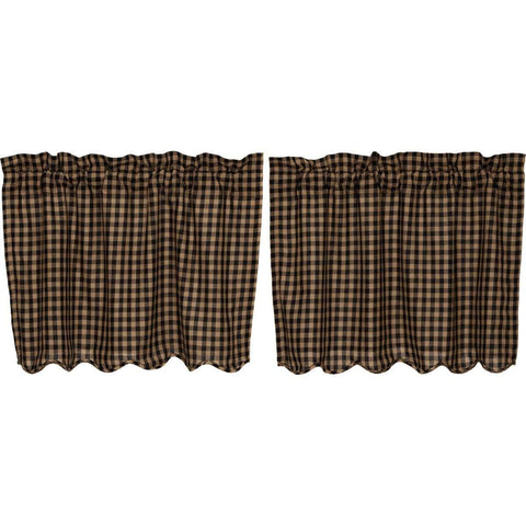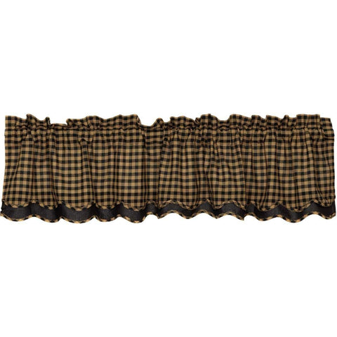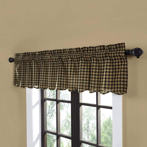 Black and khaki checks are blended with faded texture at points of intersection to give a modern facelift to the classic pattern on the Black Check Scalloped Layered Valance Curtain 16x60 . This primitive style double layer valance features classic black and khaki check pattern with solid black accent underneath; lined with white cotton and finished with a scalloped bottom...