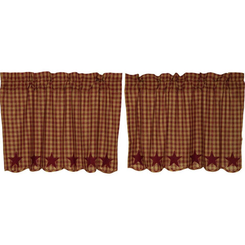 The Burgundy Star Scalloped Tier Set L24xW36offers charming small burgundy and tan checks with 5 Point stars appliqued along the scalloped edge in solid burgundy. Lined with luxurious white cotton.Features PREMIUM CONSTRUCTION: with over two decades experience crafting goods for American homes, our item are built to last for years to come. PRIMITIVE DECOR: traditional style that compliments any primitive...