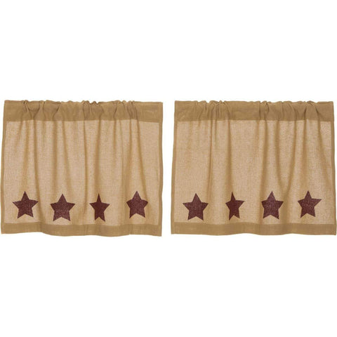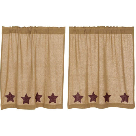 Burlap with Burgundy Stencil Stars Tier Set L36xW36 features natural burlap with a rod pocket that measures 3.25 inch in height which allows for a wide variety of hardware to be used.Features PREMIUM CONSTRUCTION: with over two decades experience crafting goods for American homes, our item are built to last for years to come. PRIMITIVE DECOR: traditional style that compliments...