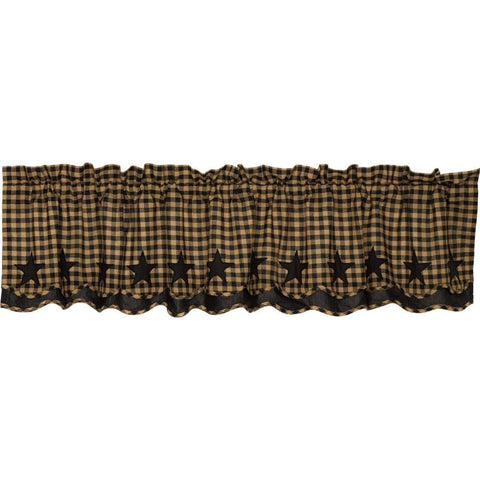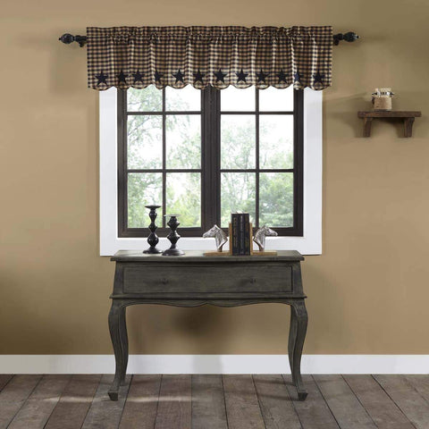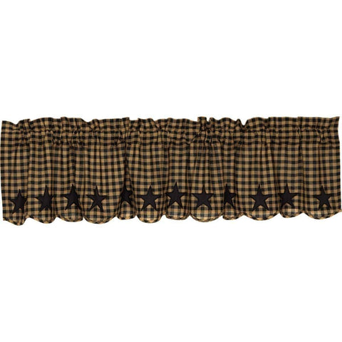 Bring a classic country mood to your window with the Black Star Scalloped Layered Valance Curtain 16x60. Featuring double layer valance with black and tan check over solid black fabric and beautifully displaying 5-point stars appliqued in solid black fabric along the bottom edge. This country curtain is lined with white cotton and finished with a scalloped edge to complete...