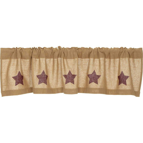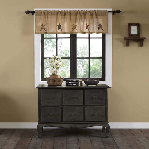 Bring the primitive look to any room with the Stratton Burlap Applique Star Valance 16x60. Constructed of cotton burlap and includes applique primitive stars in red, orange and yellow.Features PREMIUM CONSTRUCTION: with over two decades experience crafting goods for American homes, our item are built to last for years to come. PRIMITIVE DECOR: traditional style that compliments any primitive or...