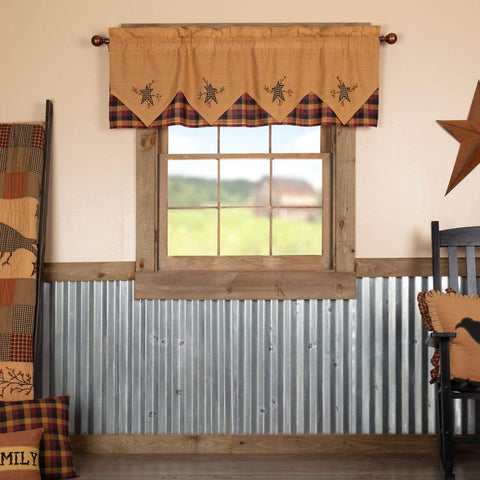 You can't go wrong with primitive stars and rustic colors of dark khaki, red-orange, and country black to spruce up your country style decor. The Stratton Primitive Star Valance Layered 20x60 features a solid tan background with black primitive stars, layered with tan and red plaid. Includes hanging loops and a rod pocket for easy hanging.Features PREMIUM CONSTRUCTION: with over...