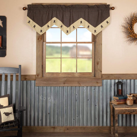 Go for a down-to-earth classic country look with the Kettle Grove Star Valance 20x60. Featuring a favorite primitive star design on a dark creme pointed-edge trim with the traditional ditsy flower pattern, accompanied by country black, khaki, and dark creme plaid. Lined - 100% cotton.Features PREMIUM CONSTRUCTION: with over two decades experience crafting goods for American homes, our item are built...