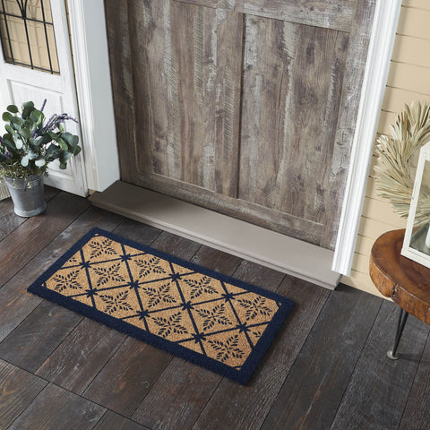 Welcome guests with the charming elegance of the VHC Brands Charleston Mosaic Blue Coir Welcome Rug Rect 17x48. This beautifully crafted doormat showcases an intricate deep blue mosaic design that stands out vividly against a natural tan background. The rustic aesthetic and detailed graphic make it a perfect addition to any home with a primitive or Southern-inspired style. Made from...