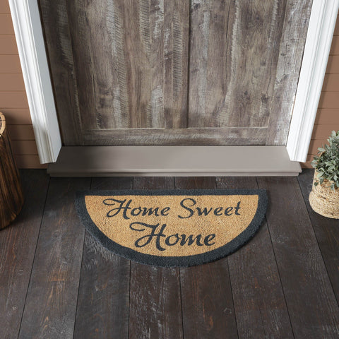 Welcome your guests with the warm, rustic charm of the VHC Brands Home Sweet Home Coir Welcome Rug Half Circle 16.5x33. This beautifully crafted doormat features the phrase Home Sweet Home in dark grey, stenciled against a natural tan coir background. Its half-circle shape adds a unique and inviting touch to any entryway, making it a perfect fit for country...