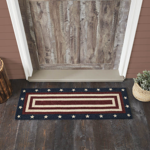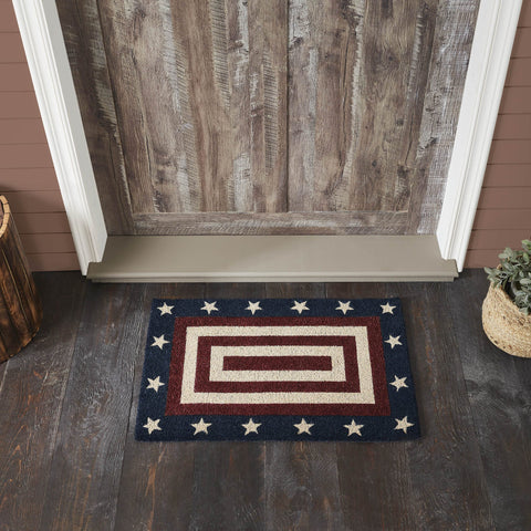 Show your patriotic spirit with the VHC Brands Patriotic Stars Welcome Coir Welcome Rug Rect 17x48. This eye-catching doormat features five-point stars in vibrant shades of merlot red and country blue, surrounding a bold Welcome greeting on a natural tan base. The addition of a red border enhances the design, making it a perfect accent for any entryway, especially during...