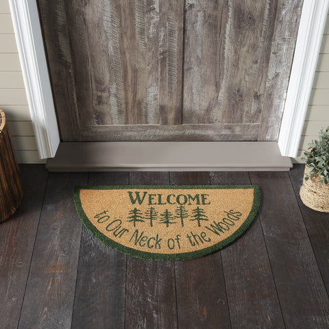 Welcome guests with rustic charm using the VHC Brands Neck Of Woods Coir Welcome Rug Half Circle 16.5x33. This beautifully crafted doormat features a natural tan coir base, adorned with the inviting message Welcome to Our Neck of the Woods encircling stenciled trees in black forest green. The half-circle design adds a unique touch to your entryway, combining style and...