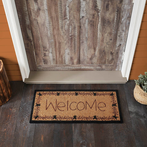 Welcome guests with the rustic elegance of the VHC Brands Pip Vinestar Coir Welcome Rug Half Circle 16.5x33. This beautiful entry rug features a natural tan coir base, adorned with black stars and burgundy vines with berries, surrounding the stenciled word Welcome in the center. The design is enhanced by a bold black border, giving it a classic country look...